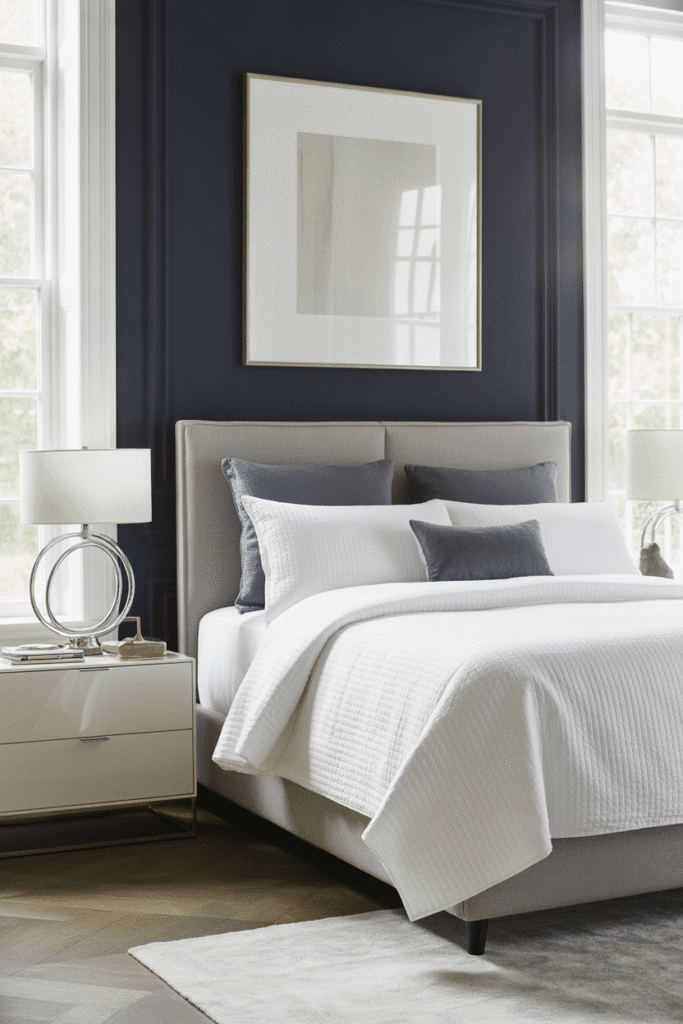 If you want instant sophistication, paint one wall in a deep navy. This bold shade grounds the space and makes lighter elements such as crisp white bedding and metallic lamps stand out. Add gold or brass accents for warmth or silver details for a sleek modern twist.