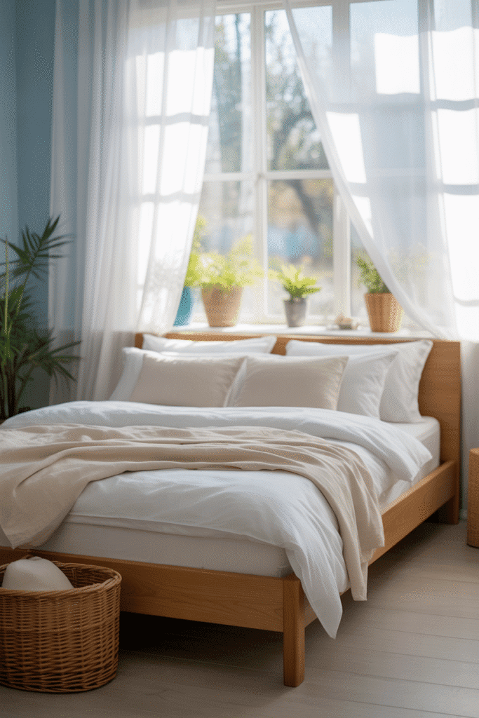 Sky blue reflects light beautifully, making small bedrooms appear more spacious. Layer in soft fabrics like cotton or linen for a relaxed breathable feel. Add potted greenery to bring life and freshness into the space. This palette is perfect for creating a restful environment that encourages relaxation.