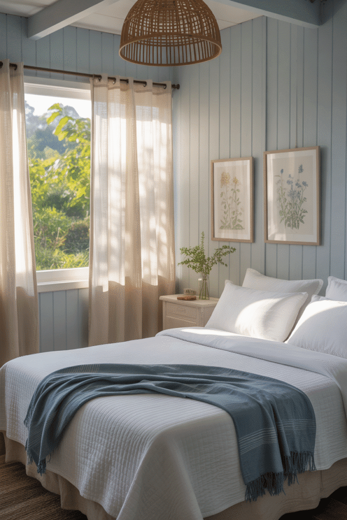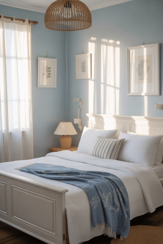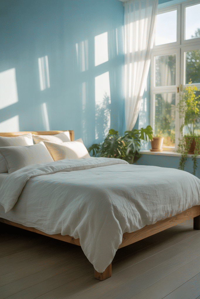 For a light and airy feel, choose sky blue walls. Pair with white linens, natural wood furniture, and sheer curtains. This combination creates a breezy and calming vibe that feels like a never ending summer morning.
