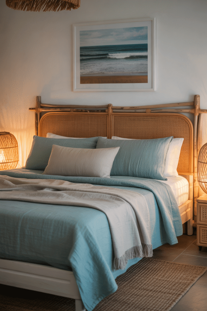 Play with textures such as woven baskets, seagrass rugs, and linen bedding to reinforce the natural aesthetic. Use artwork that hints at ocean landscapes without feeling too literal. Muted lighting with warm bulbs enhances the coastal mood. This style creates the perfect balance between elegance and beach inspired comfort.