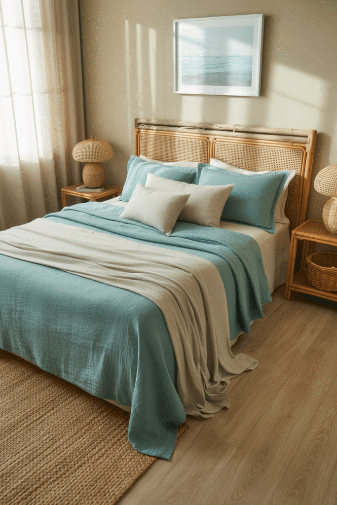 Instead of going for an obvious beach theme, opt for layered shades of teal, turquoise, and sandy beige. Add rattan furniture or driftwood inspired decor for a subtle coastal feel that is both modern and cozy.