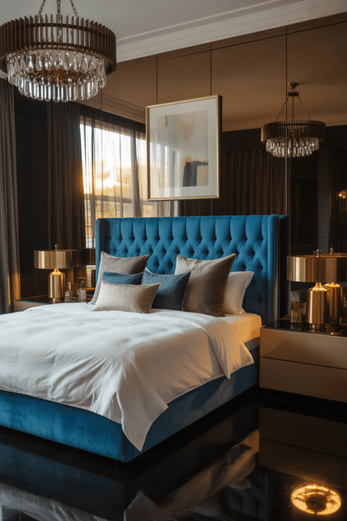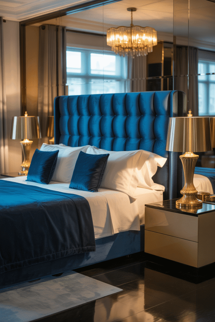 Velvet naturally reflects light which adds depth and dimension to the color. Pairing it with metallics like brass or chrome creates a glamorous contrast. Consider layering multiple shades of blue for a curated and sophisticated look. This design works especially well in master bedrooms where you want a sense of indulgence.