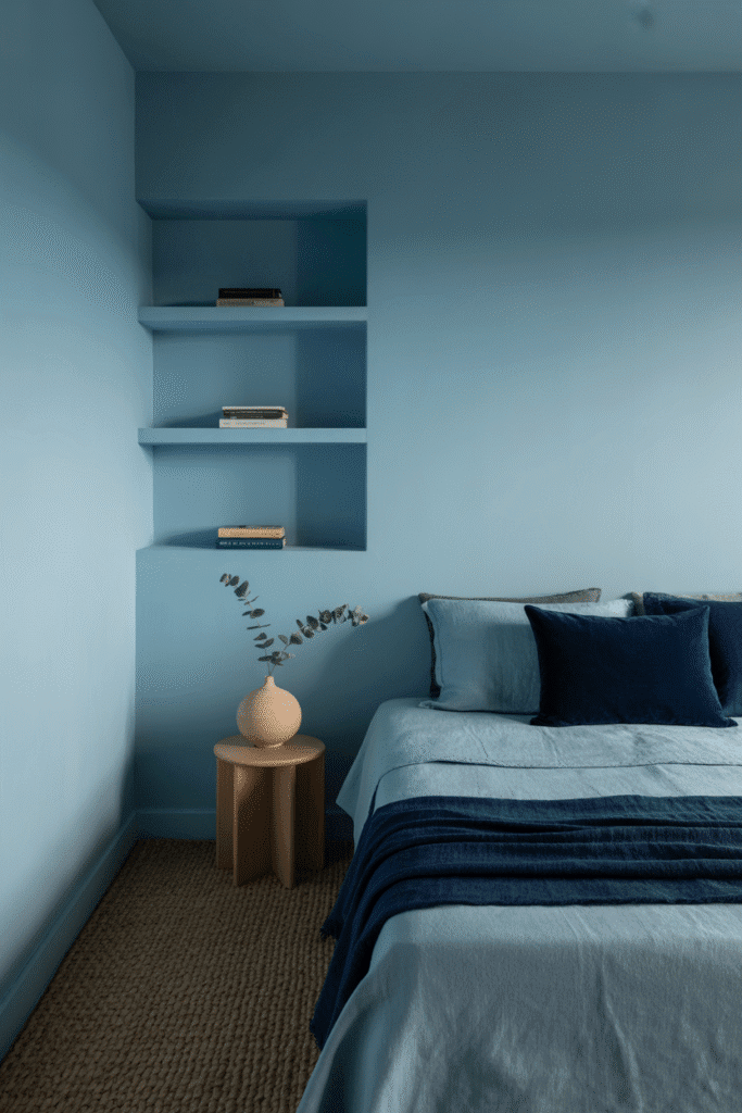 A monochrome palette feels clean and contemporary. Stick to one shade of blue but use varying tones such as pale walls, medium toned bedding, and darker accent pieces. The result is layered yet simple and perfect for a minimalist retreat.