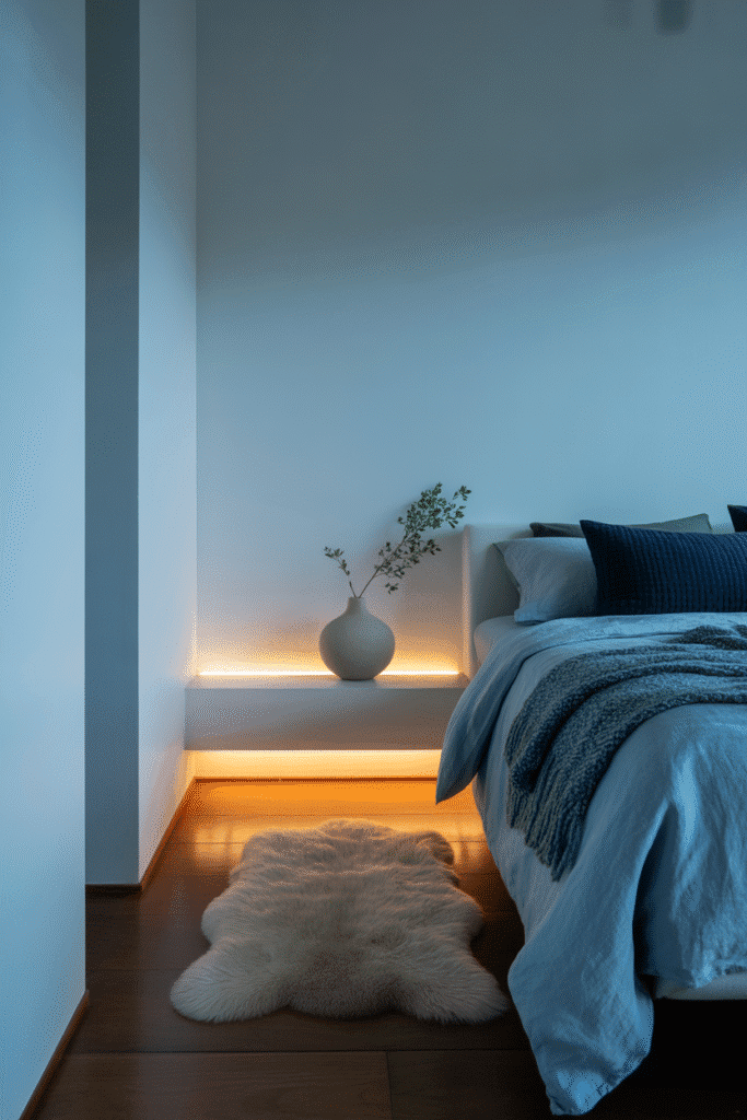 Add subtle interest with different textures like linen, wool, or matte ceramics. Built in storage or sleek floating shelves keep clutter to a minimum. Lighting should be simple but purposeful with a focus on warm ambient tones. This approach creates a soothing environment that encourages mindfulness and rest.