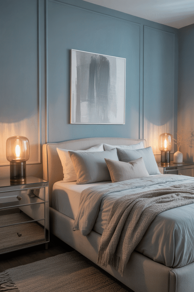 Pair muted blue walls with soft gray textiles for a calming modern space. This color combination is especially good for small bedrooms since it creates depth without overwhelming the eye. Add a wool throw or linen curtains to enhance the coziness.