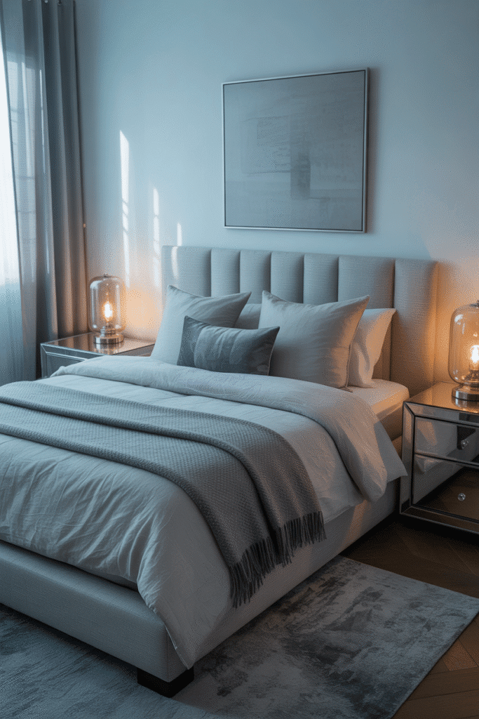Gray balances the coolness of blue resulting in a harmonious look. Try a gray upholstered bed frame or rug to tie the two shades together. Accent pieces such as glass lamps or mirrored furniture can add brightness. This palette is ideal for a bedroom that feels both stylish and restful.