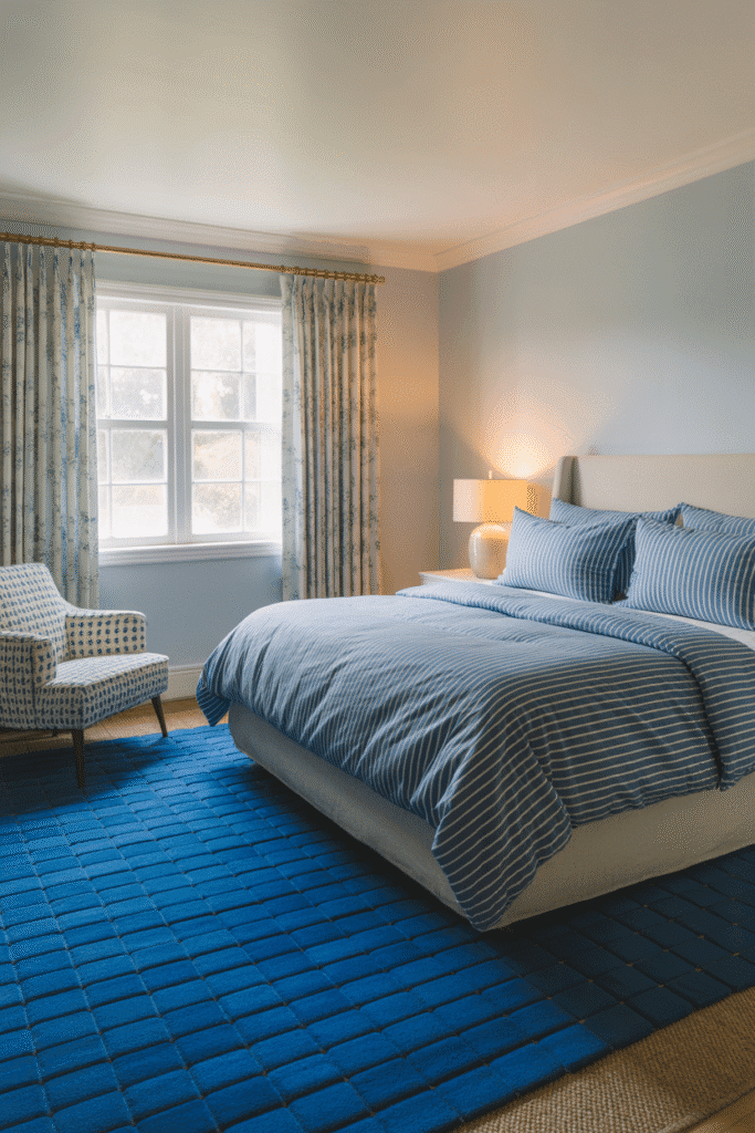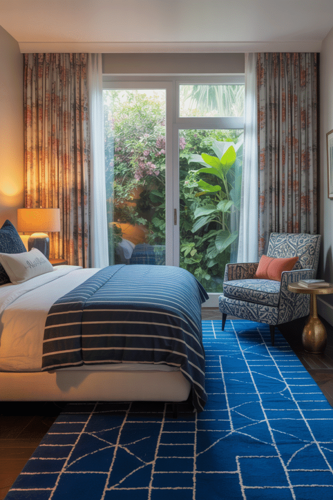 Introduce personality with blue patterns. Striped bedding, floral curtains, or a geometric rug can transform a plain room. To avoid visual overload, keep the rest of the decor simple with neutral walls and furniture.