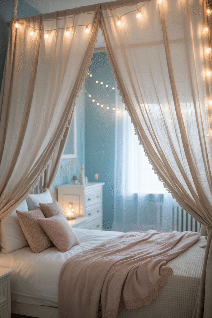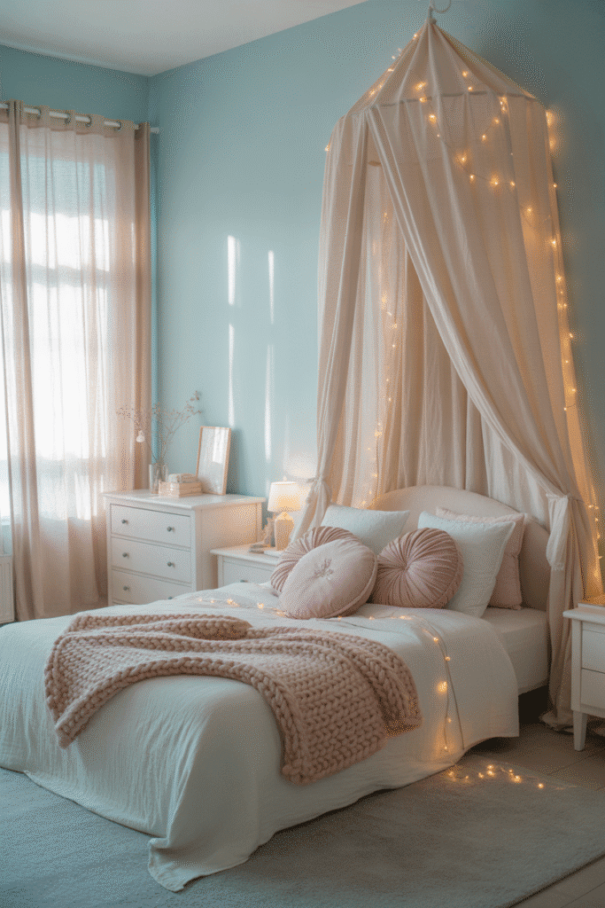 Pastel blue walls bring a dreamy and soft aesthetic to the bedroom. Complement with white furniture and linen curtains for a whimsical retreat. Add fairy lights or a canopy bed to enhance the cozy ethereal vibe.