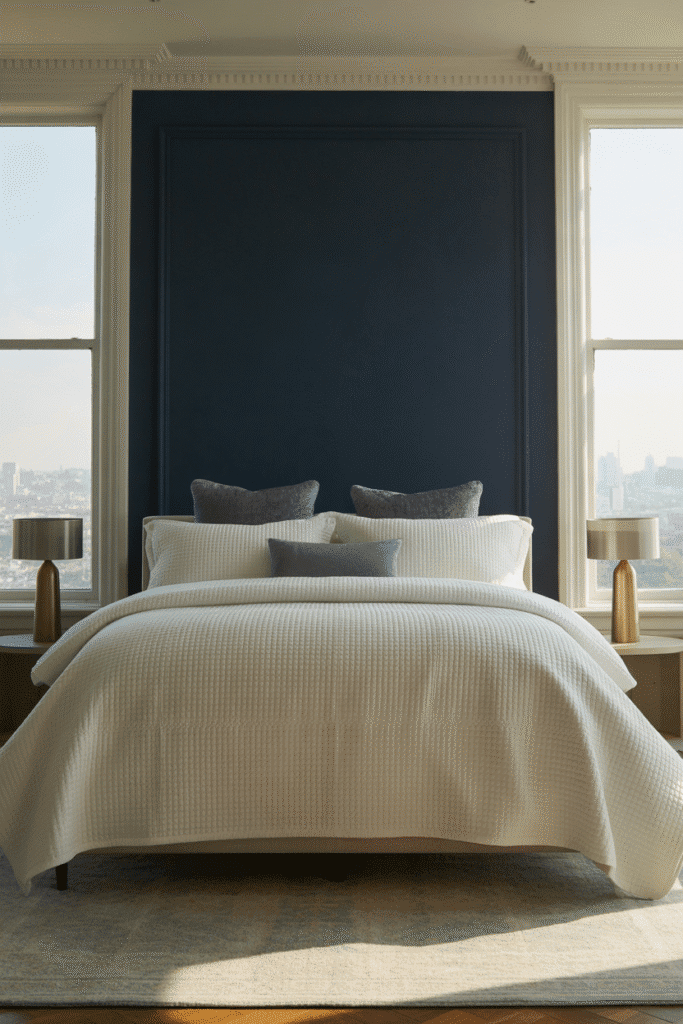 If you want instant sophistication, paint one wall in a deep navy. This bold shade grounds the space and makes lighter elements such as crisp white bedding and metallic lamps stand out. Add gold or brass accents for warmth or silver details for a sleek modern twist.