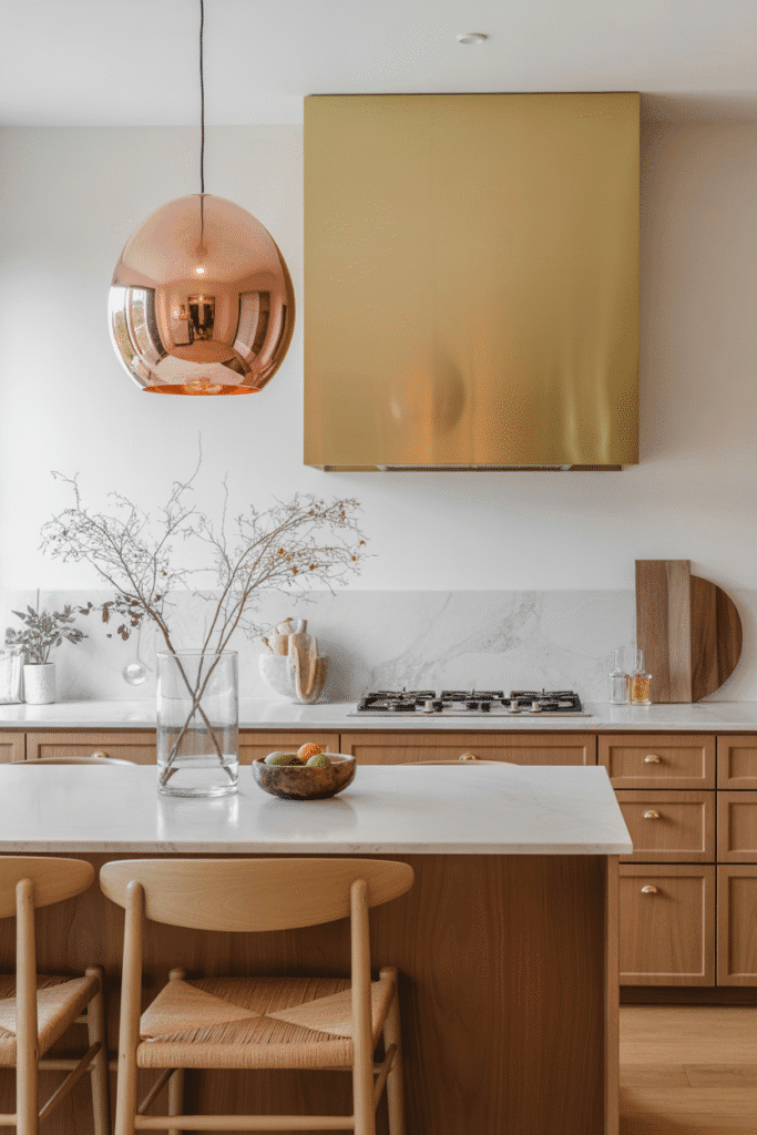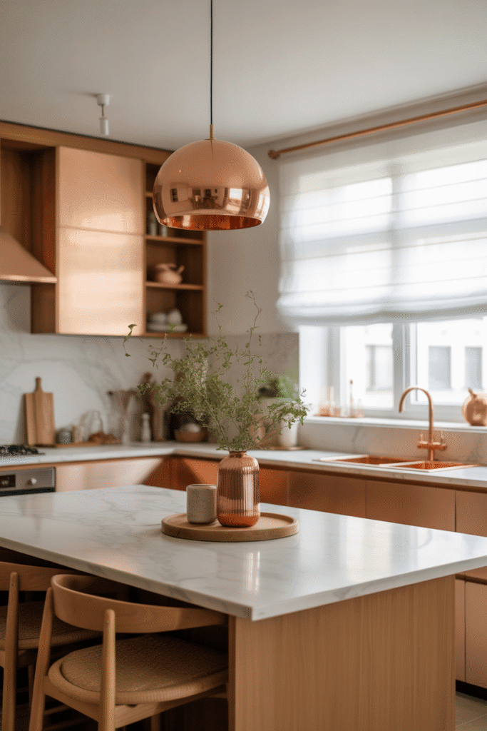Swap a traditional kitchen light with a copper pendant that hangs above your island or dining nook. The reflective surface brings in a glow that softens the space. Choose a matte or brushed finish to avoid a mirror effect and match it with wood or marble for contrast.