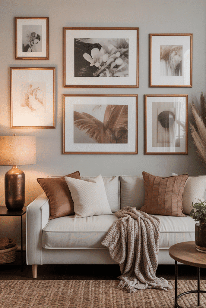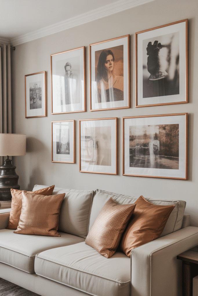 Frame your artwork or photographs with thin copper frames instead of black or white. This subtle switch creates warmth and ties everything together visually. For best results, stick to cohesive spacing and mix in a few textured pieces like fabric or paper art.