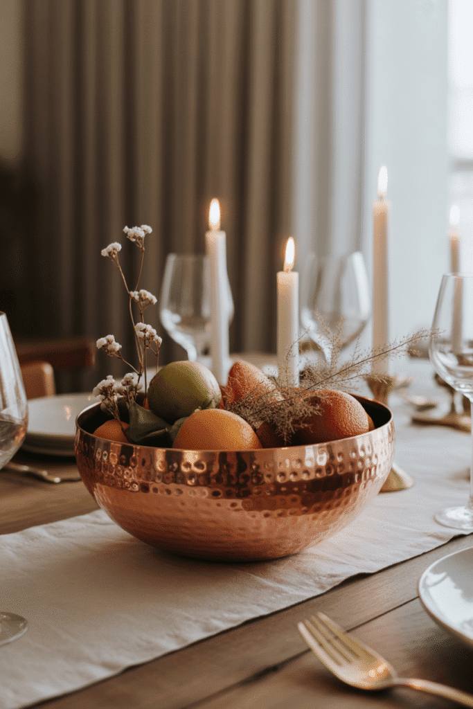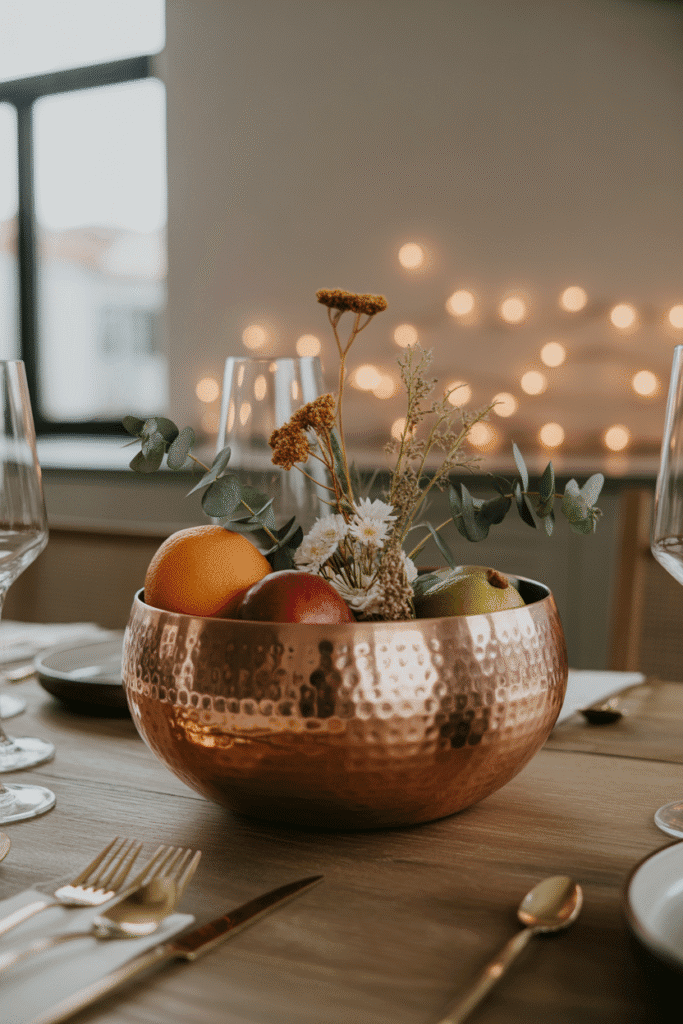 Place a large hammered copper bowl on your dining or coffee table. Use it to hold fresh fruit, dried botanicals, or decorative objects. The texture and sheen draw attention while keeping the piece practical and grounded in everyday use.