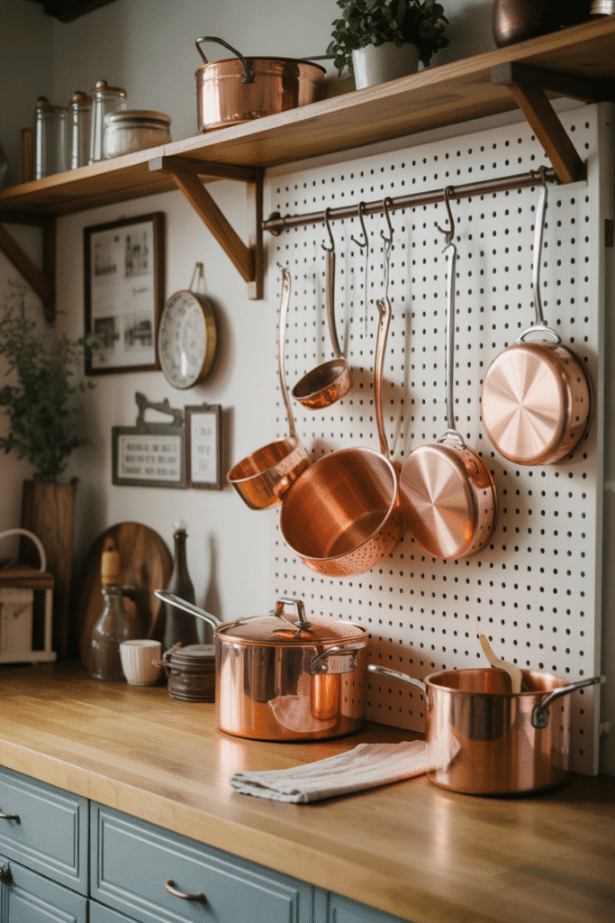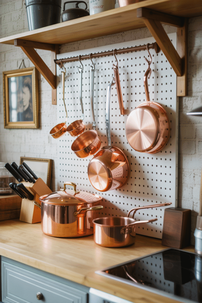 Hang copper pots, ladles, or measuring cups on a rail or pegboard rather than hiding them in cabinets. The shine creates visual movement and introduces a classic, well loved kitchen aesthetic. It works beautifully in modern and farmhouse styles alike.