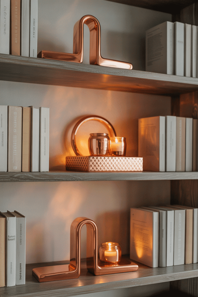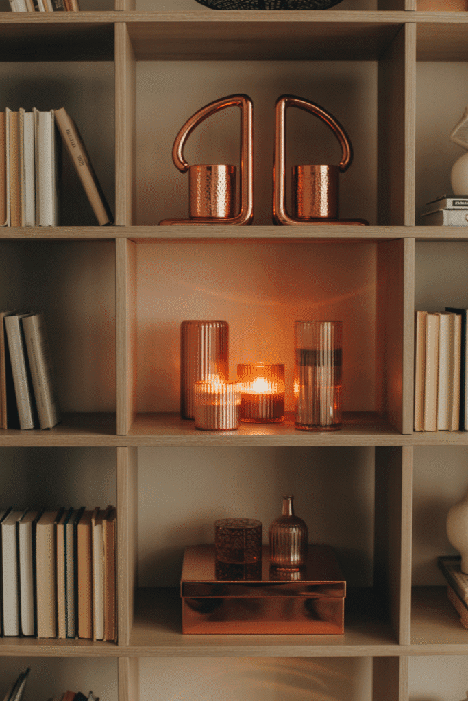 Mix in copper toned bookends, candle holders, or decorative boxes on your shelf. Use just a few pieces across the entire shelving unit to add rhythm without distraction. The warm metallic finish adds contrast against books, wood, or neutral decor.