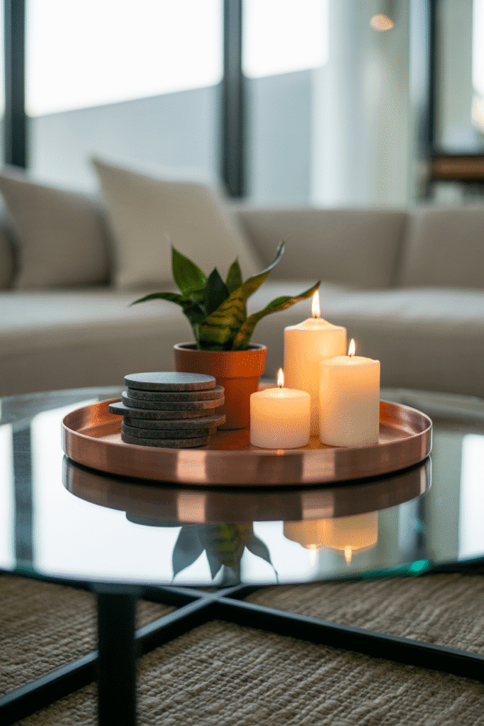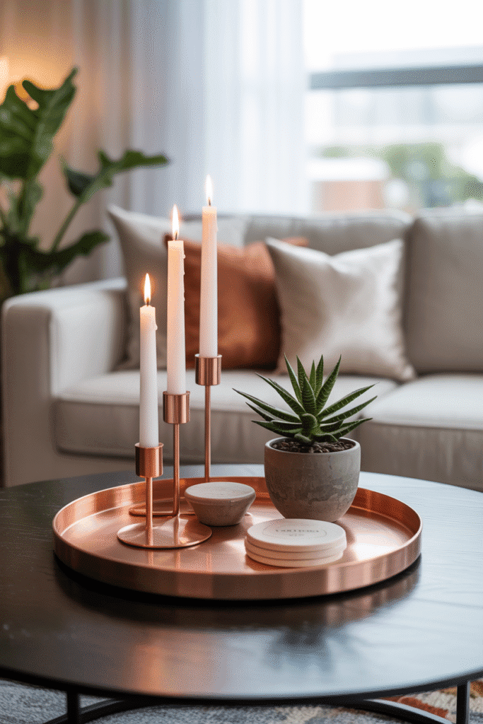 A copper tray on a console or coffee table helps corral small items while adding a touch of elegance. Use it to group candles, coasters, or a small plant. This keeps things neat and provides a polished focal point in high traffic areas.