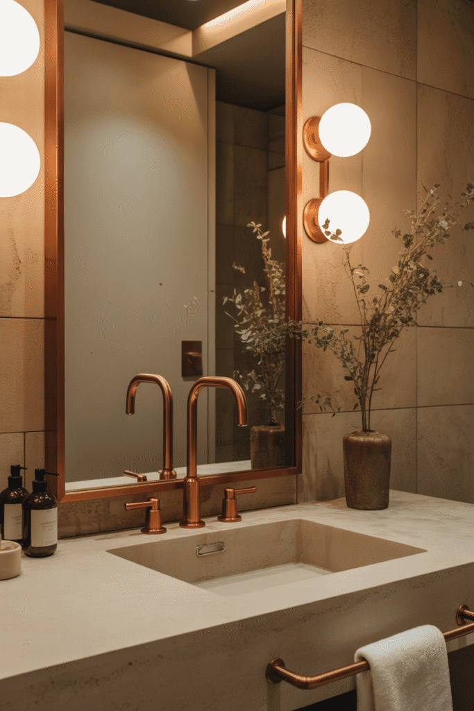 Switch out standard faucet and hardware finishes for copper or copper toned pieces. These instantly elevate the space and pair well with stone, ceramic, or concrete surfaces. Even a small change like a copper soap dispenser can add a cohesive touch.