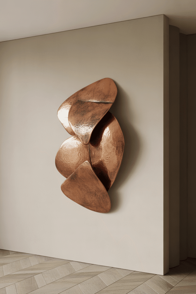 Look for abstract or geometric copper wall art to bring texture to a blank wall. These pieces are often made from hammered or layered copper and work well as stand alone focal points. The natural patina of the material adds richness over time.