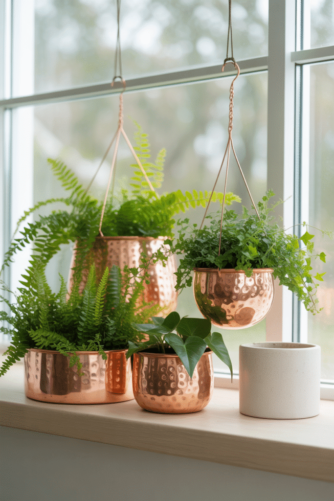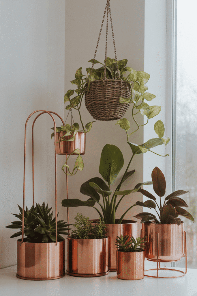 Planters made from copper or with copper detailing can transform a simple indoor plant into a design element. Use hanging baskets near windows or tall stands in a corner. The metal complements greenery while keeping the look crisp and intentional.