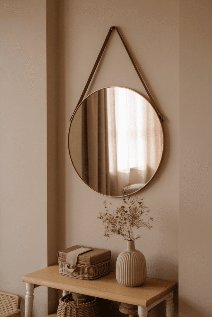 A circular copper mirror adds both reflection and sculptural softness to a room. Hang one in the entryway or above a sideboard. The glow of copper around the mirror adds depth without the need for extra lighting or bold colors.
