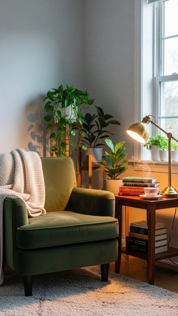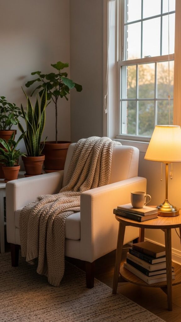 A reading nook doesn’t require a separate room. A small corner can easily become your comfort spot. Place a cushioned chair with good back support, add a side table for your cup or books, and complete the setup with a warm lamp. A soft throw across the chair adds visual comfort while giving you warmth on colder days. Pair it with a plant or floating wall shelf to give the nook a finished, personal touch. Even if you don’t read often, the nook becomes a peaceful retreat inside your home.