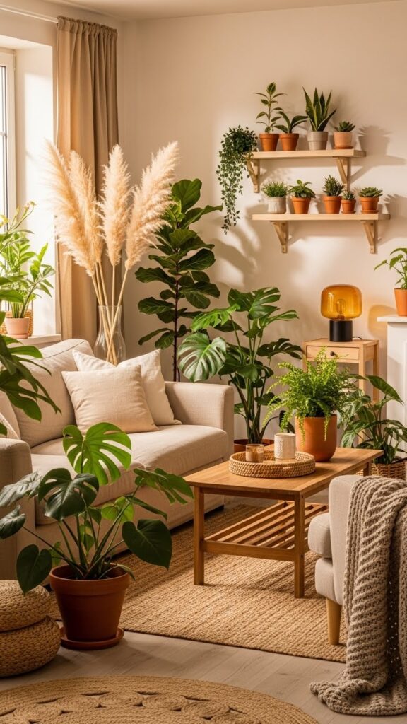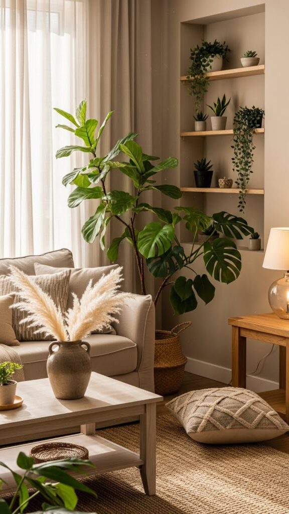 Plants are a natural way to make a home feel alive and welcoming. They add color, fill empty corners, and help soften sharp lines of furniture. A combination of leafy plants, a snake plant for low maintenance, a small tabletop plant, and a vase of pampas grass creates a balanced natural touch. Plants also improve air quality, adding a subtle sense of freshness to your living space. Whether you prefer real or high-quality artificial plants, the warmth they add is unmistakable.
