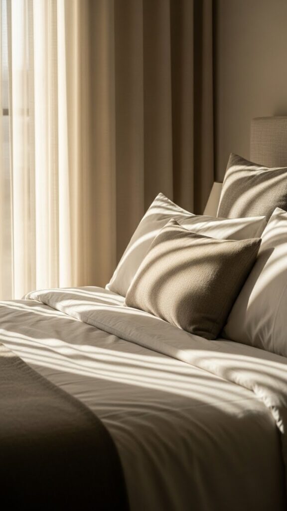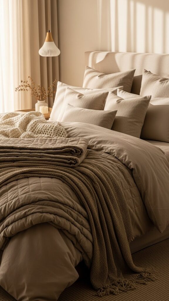 A cozy bedroom is all about thoughtful layering. Start with soft sheets, add a warm quilt, then a plush comforter. Oversized pillows create volume and softness, making the bed look inviting even before you step into it. A long accent cushion or a textured throw at the foot of the bed completes the look. Soft neutral tones work best for creating a calm, restful environment. When layered properly, the bed becomes the centerpiece of comfort in your home.
