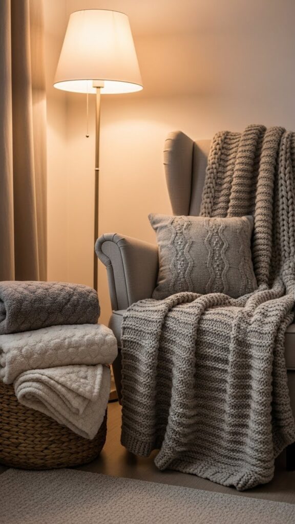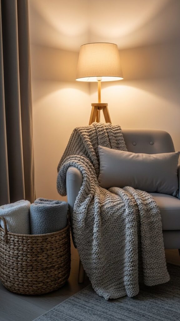 A cozy corner becomes the heart of a room when layered with soft blankets and warm textures. Start with a comfortable chair or cushioned bench. Add a chunky knit throw draped over the arm, fold a couple of fleece blankets, and place them in a woven basket nearby. Soft lighting is essential, so a warm-toned floor lamp or a small table lamp will create the perfect evening glow. This corner becomes the spot where you drink tea, scroll through your phone, read, or simply unwind.