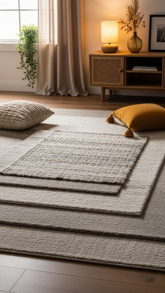 Rugs define a space and add warmth, especially in rooms with wooden, tiled, or bare floors. A large neutral rug works as the base, and a second smaller rug layered on top introduces contrast and charm. A faux fur rug, woven wool rug, or a fluffy shag rug adds both texture and softness under your feet. Layered rugs make the room feel fuller, more dimensional, and far more inviting.