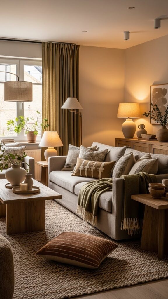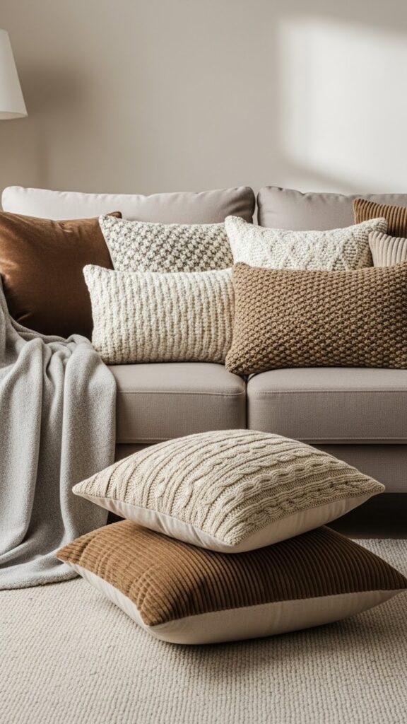 Cushions play a big role in creating a cozy look. Instead of matching everything perfectly, focus on mixing different textures. Velvet pillows add softness, boucle brings a cozy woolly feel, knitted cushions give a handmade vibe, and corduroy adds rich lines and warmth. Mixing these textures makes your sofa feel fuller and more comfortable, encouraging everyone to settle in and relax. This small detail instantly adds personality and depth to any room.