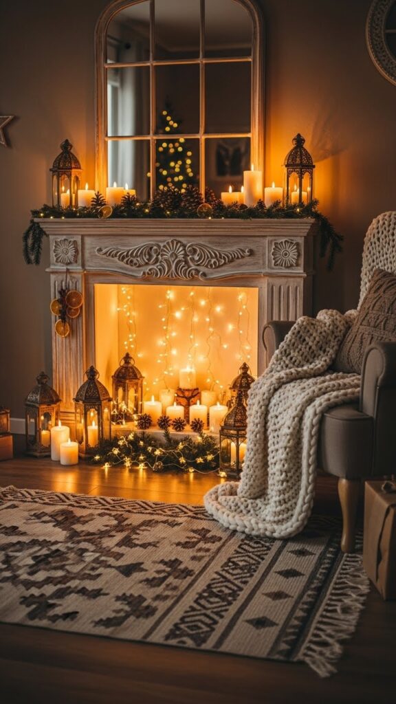 A fireplace is the ultimate cozy element, but you don’t need a real one to achieve the ambiance. A faux fireplace with candles, lanterns, or string lights placed inside a decorative mantel creates a warm central point in the room. The gentle flicker of candlelight adds movement and comfort during evenings. You can decorate the mantel with framed photos, books, or small plants to complete the look. This idea works beautifully in living rooms, bedrooms, or any space lacking a natural focal point.