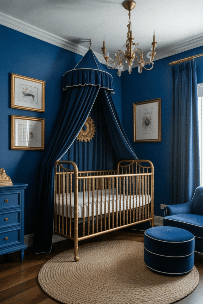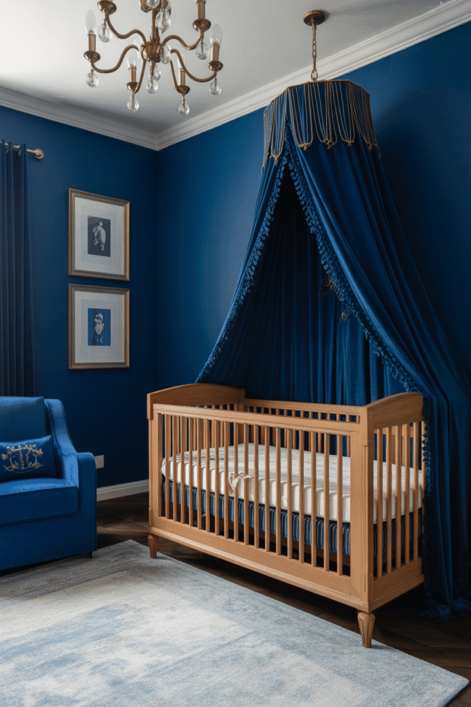 Deep navy paired with gold accents lends the room a sense of timeless dignity. Velvet textiles and framed artwork add richness, while a canopy crib becomes a striking focal point. The look is traditional but softened by layered lighting and cozy fabrics. It brings sophistication without losing comfort, offering a nursery that feels both regal and nurturing. Installing a dimmable chandelier elevates the aesthetic, while transitional furniture guarantees that the design will stay relevant as your child grows.