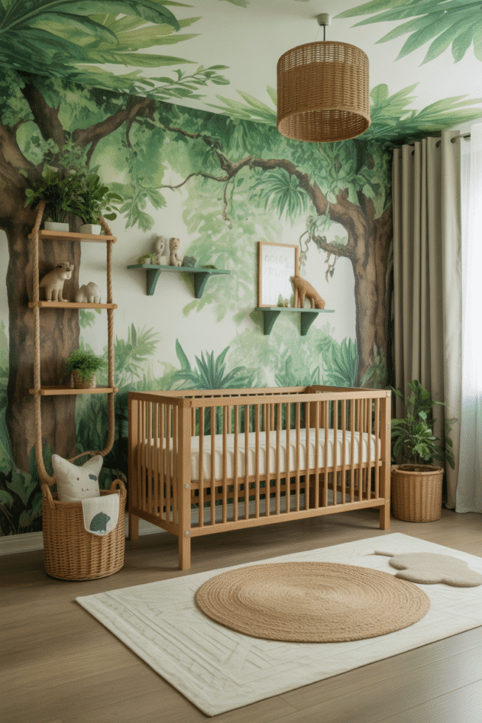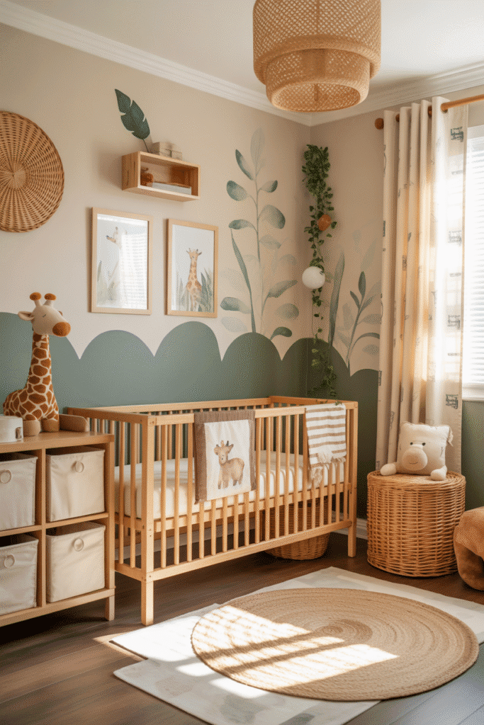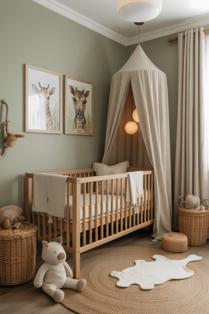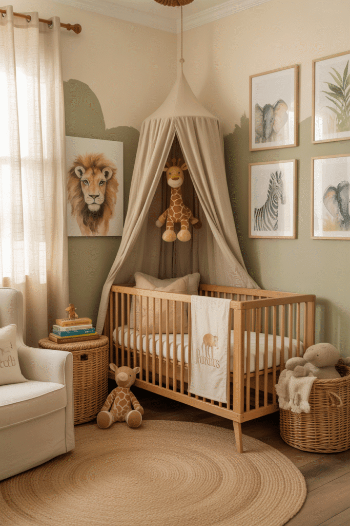 A softer take on safari design brings calm earth tones and natural fibers into the nursery. Sage greens and cream-colored walls create balance, while watercolor animals add charm. Linen curtains, plush toys, and woven baskets make the room both functional and inviting. This style evokes nature’s beauty in a way that is peaceful rather than overstimulating. Adding an organic cotton canopy creates a cozy reading corner, while natural-fiber rugs reduce allergens and enhance comfort.