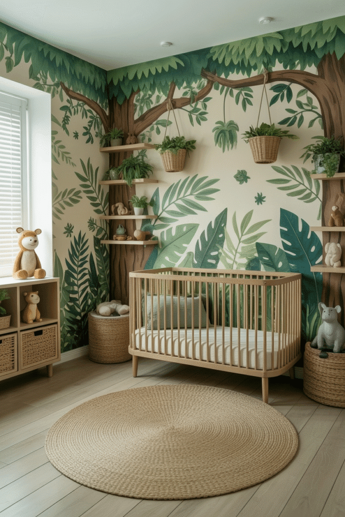 Lush green walls or wallpaper with leafy patterns create the impression of being beneath a rainforest canopy. Hanging planters, animal figures, and textured rugs extend the theme in subtle ways. The space feels playful while offering strong sensory engagement. It is a room that encourages imagination and brings the outdoors closer. Using breathable cotton fabrics ensures comfort in warm climates, and incorporating height-adjustable shelving makes the space functional over time.