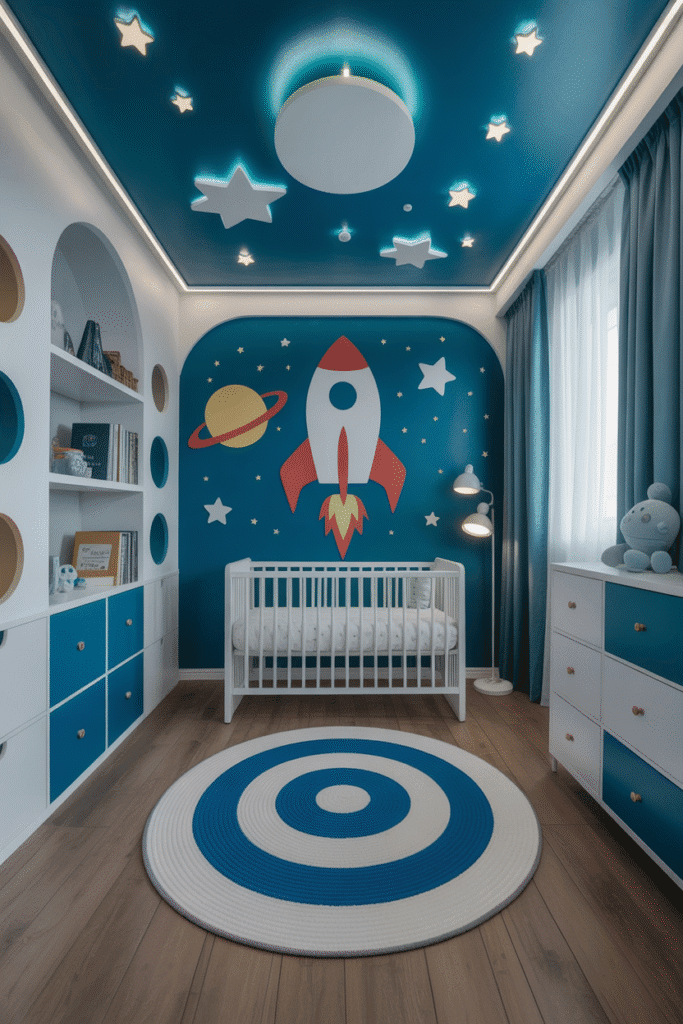 This concept uses clean whites, deep blues, and metallic accents to build a futuristic feel. Glow-in-the-dark stars and planet decals spark bedtime imagination, while structured shelving keeps the room functional. A rocket-shaped bookshelf or mobile ties the theme together. The design encourages exploration while maintaining order, striking a balance between energy and calm. Installing dimmable LED ceiling lights allows you to mimic a starry atmosphere, and convertible furniture ensures longevity as interests evolve.