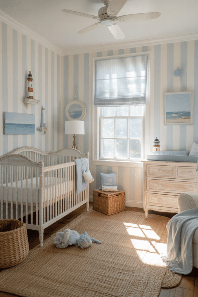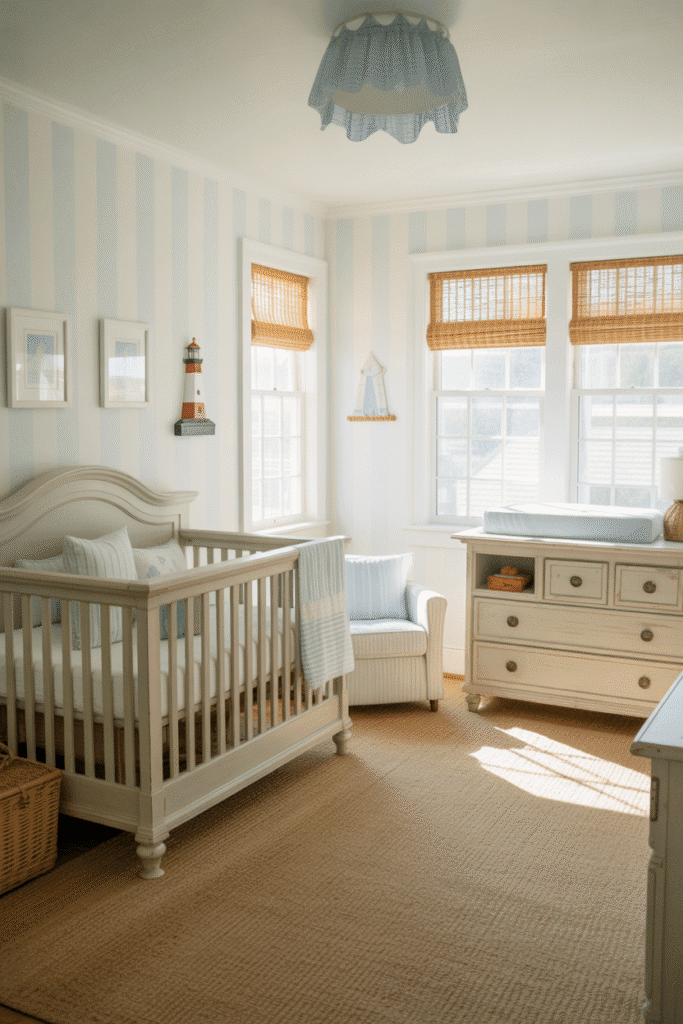 A gentler version of seaside style, this nursery uses pale blue and cream stripes alongside whitewashed wood furniture. Accessories like woven rugs and small-scale lighthouse decor add detail without clutter. The layout makes natural light a key feature, giving the space a restful, open feel. It is designed to be both cozy and bright. Moisture-resistant paints help maintain the fresh look in humid climates, and layered window treatments allow flexible control of light.