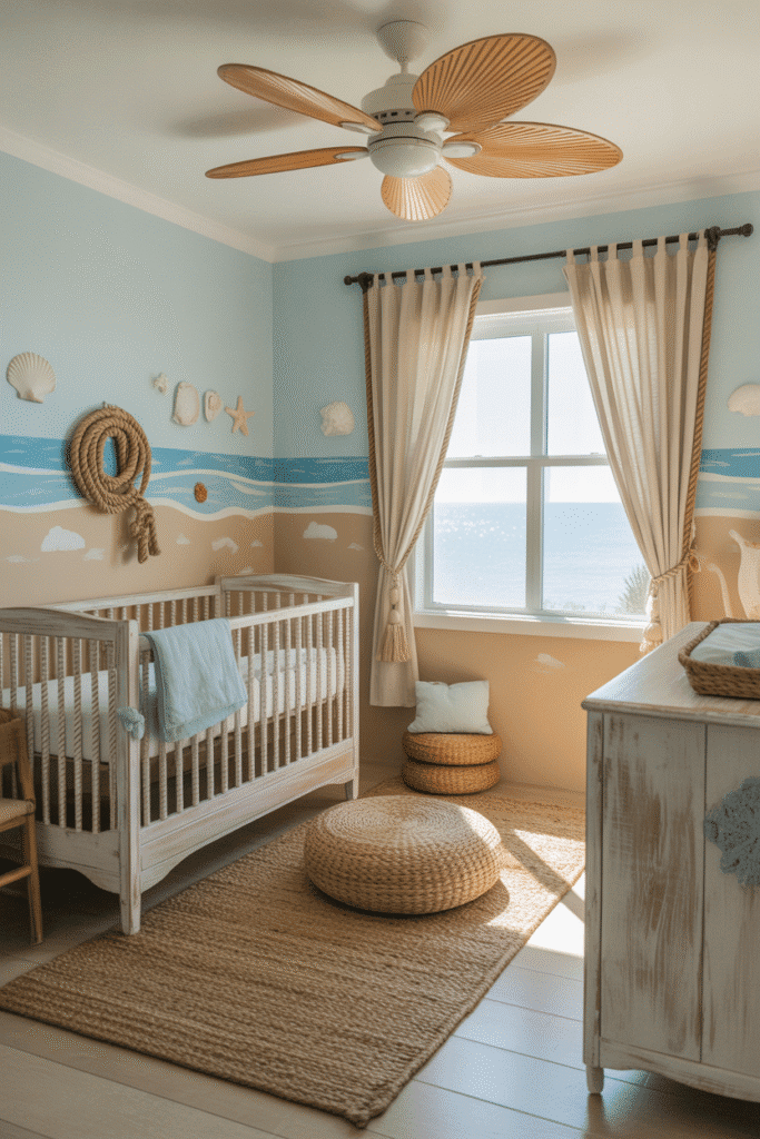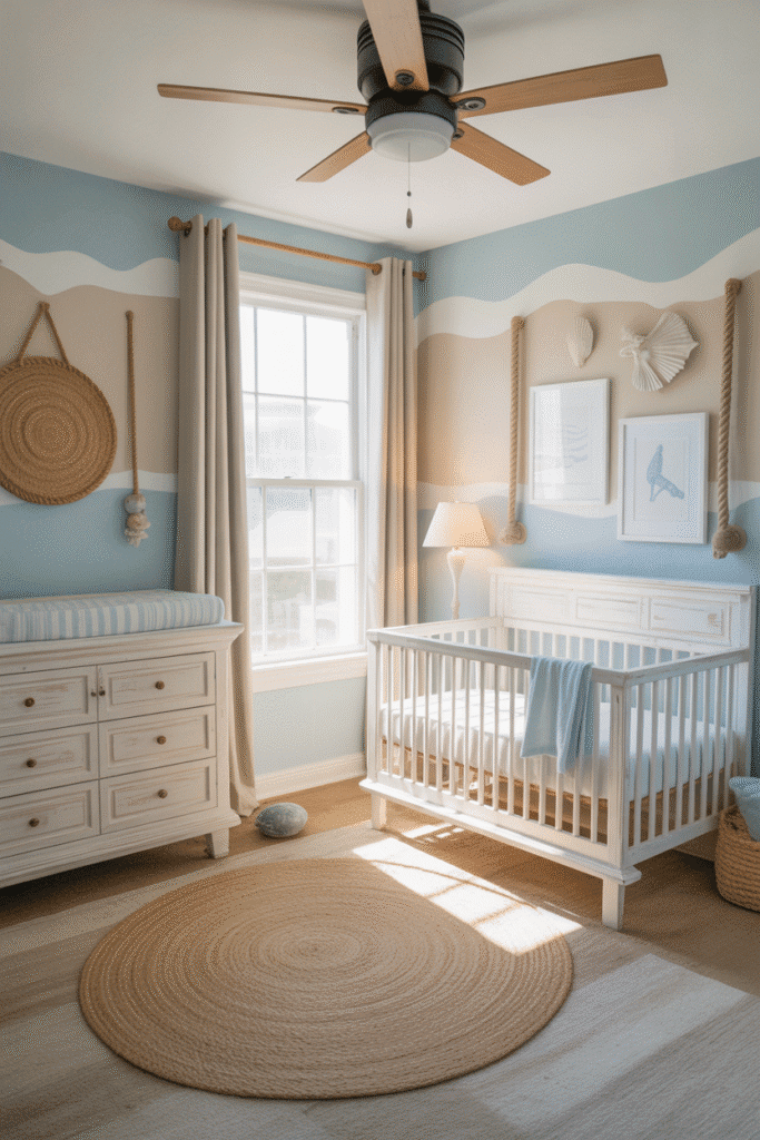Pastel blues and sandy beiges create a seaside calm that feels fresh and timeless. Whitewashed furniture paired with light linen fabrics keeps the space breathable and soft. Rope details, seashell accents, or woven rugs add quiet layers of texture. The result is an airy retreat where your baby can grow with ease. A ceiling fan with wooden blades not only completes the coastal feel but also regulates airflow, while washable slipcovers make upkeep simple for busy parents.