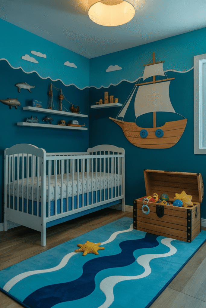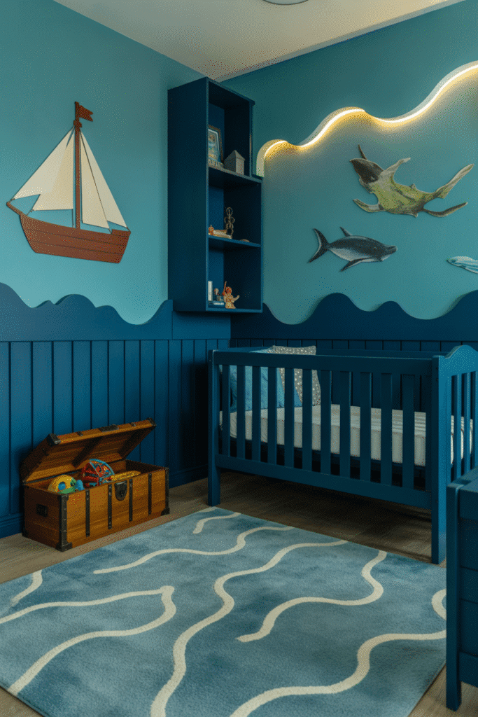 Deep aqua tones, treasure chest storage, and ship-inspired details create a playful yet soothing environment. Textured rugs mimic the movement of waves, while murals or art of marine life provide storytelling opportunities. The atmosphere feels adventurous but never chaotic, keeping relaxation at its heart. It’s a design that balances excitement with serenity. Installing a night-light with gentle wave projections adds magic to bedtime, and modular toy storage keeps the adventurous theme tidy.