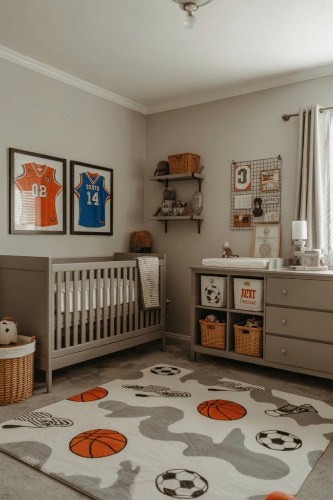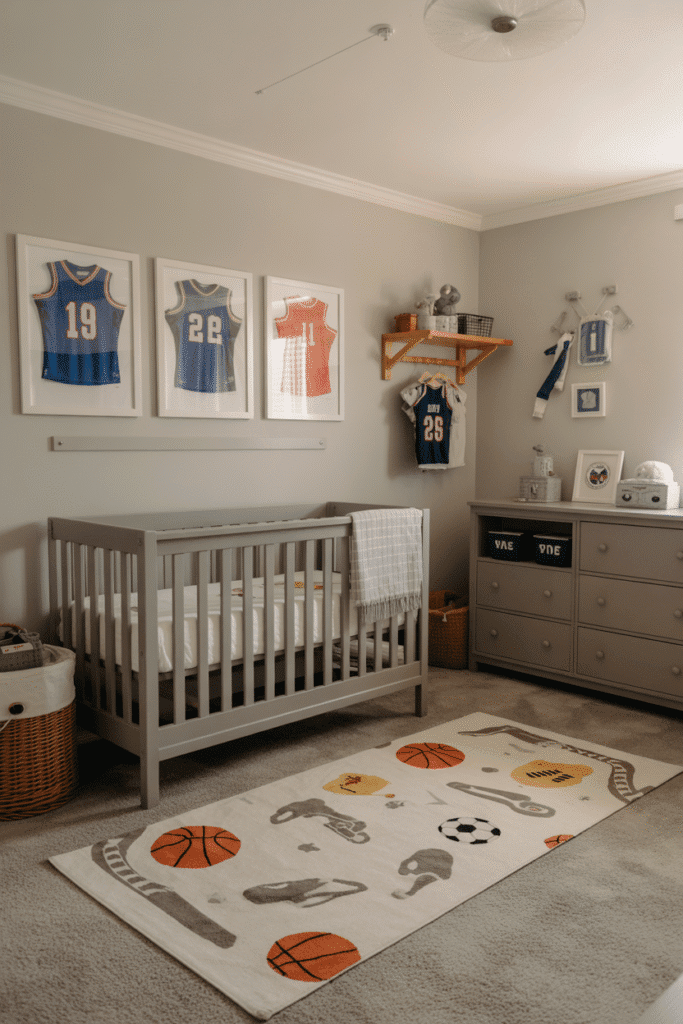 Sports can be introduced in subtle ways through framed jerseys, patterned rugs, or themed storage solutions. A neutral base keeps the look versatile while allowing accents of basketballs, footballs, or baseballs to shine. This approach ensures the nursery will remain adaptable even if interests change. It combines energy with refinement, making the room engaging but never overwhelming. Opt for wall-mounted racks to display memorabilia safely, and consider a multi-use dresser with built-in storage to manage gear efficiently.