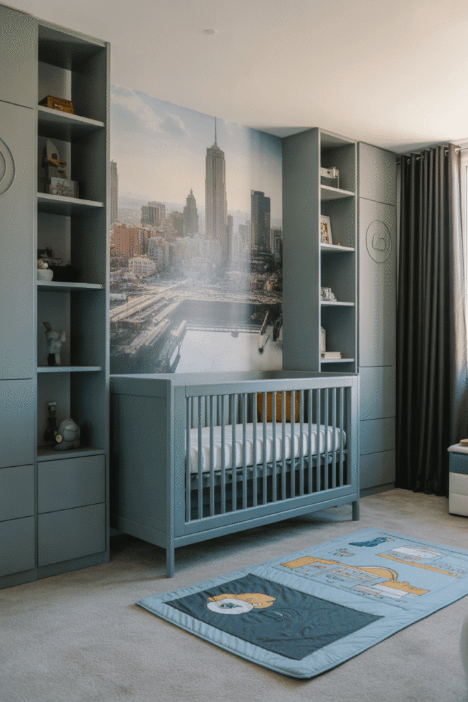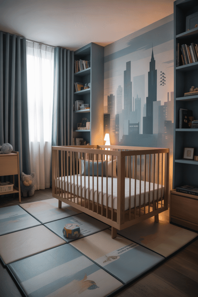 This nursery embraces modern city living with muted gray walls highlighted by soft blue accents. A large-scale mural of a skyline adds dimension, while tall shelving maximizes storage in smaller spaces. Furniture with clean lines keeps the layout uncluttered and practical. It feels polished yet warm, a space that grows naturally into a stylish toddler’s room. Soundproof curtains help manage city noise, and a foldable play mat ensures flexibility in compact spaces.
