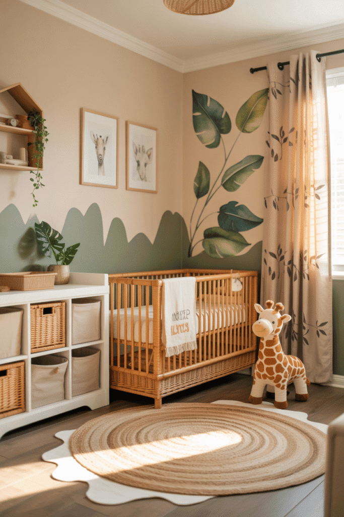 Neutral sand tones and leafy patterns bring a touch of the savannah indoors. Animal motifs appear in gentle watercolor wall art and soft plush toys, giving the space a playful personality without feeling busy. Canvas storage bins and rattan baskets keep everyday items in reach while blending into the design. The room invites curiosity and gentle discovery, making it both stimulating and soothing for infants. Adding blackout curtains with soft patterns ensures proper sleep cycles, while a layered rug provides both comfort and safety for early crawling.