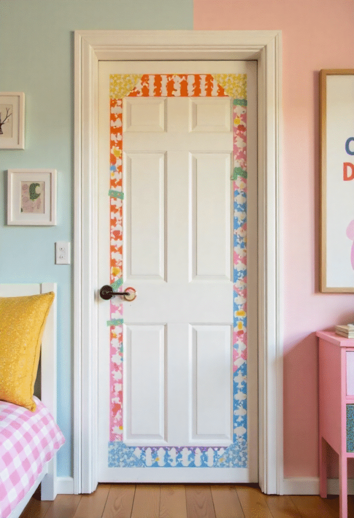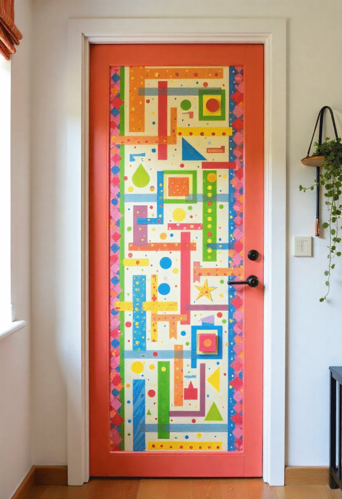 If you want to make a playful, creative statement, washi tape art is an easy and non-permanent way to personalize your door. Use colorful or patterned washi tape to create geometric designs, stripes, or even frames around the door. This technique is quick, inexpensive, and offers endless customization options. Washi tape art is perfect for those who love DIY projects and want to change up the look of their door without committing to something permanent. Plus, it’s a fun way to introduce patterns and colors into your space.