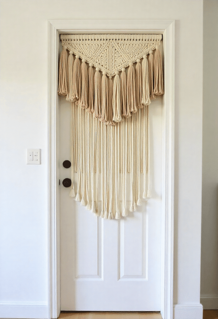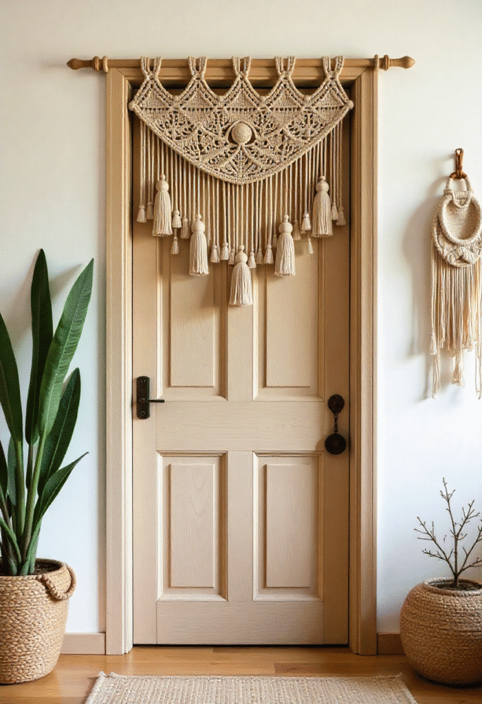 For a touch of bohemian charm, consider adding woven tassels or a macramé curtain to the top of your door. This style brings in texture and an organic, artistic vibe, making your door an eye-catching feature. Bohemian tassels add depth and warmth to the room, evoking a relaxed, free-spirited atmosphere. It’s an easy and affordable way to introduce that laid-back, creative touch that’s perfect for modern or eclectic interiors.