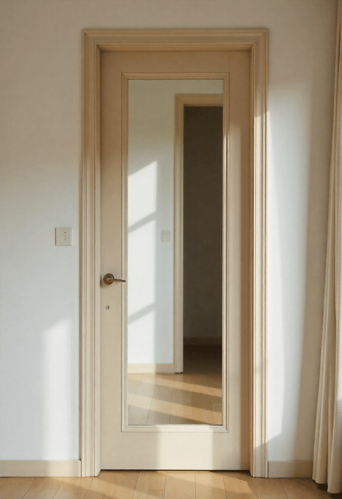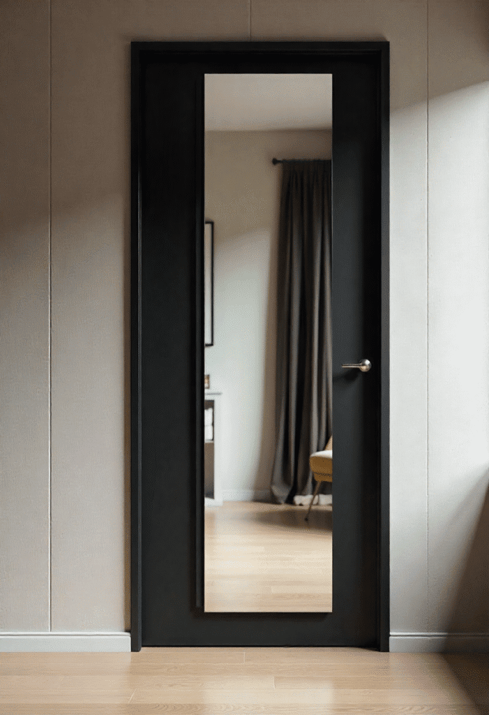 For a sleek, modern touch, consider installing a large, full-length mirror on your door. Not only does this design make the room feel bigger and brighter, but it also adds a functional element. The reflective surface will bounce light around the room, enhancing the space’s openness. A mirror door can be especially effective in smaller rooms or entryways where maximizing natural light and space is essential. This combination of style and function is a win-win.