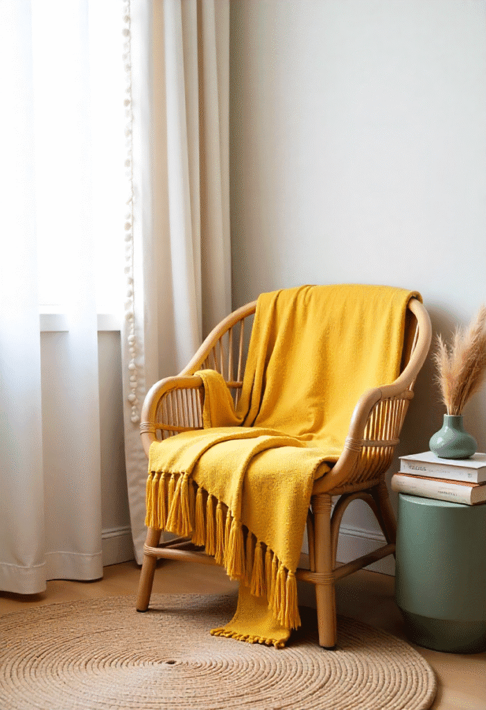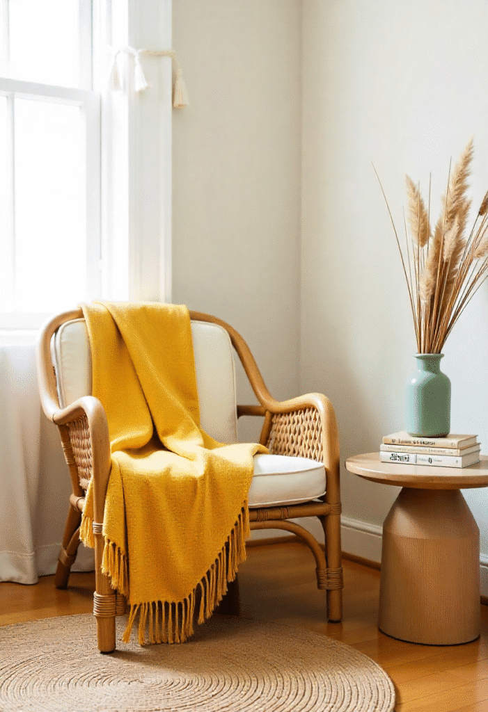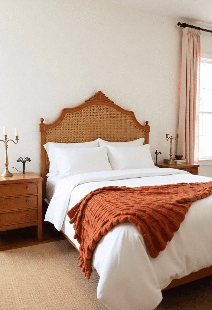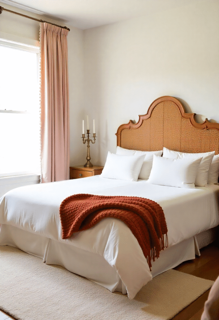 Upgrade your bedroom with a handwoven rattan or wicker headboard in an arched or geometric design. Pair it with crisp white bedding and a chunky knit throw in a rich hue like terracotta or mustard. The natural texture of rattan contrasts beautifully with soft linens, creating a cozy yet stylish retreat that feels straight out of an Anthropologie catalog.