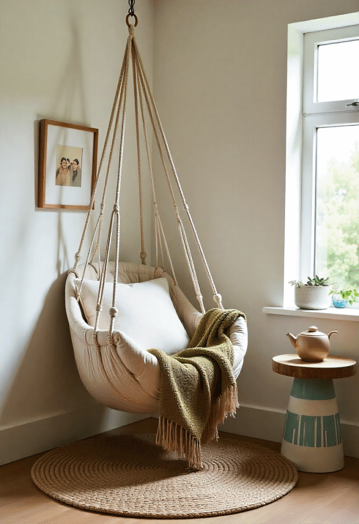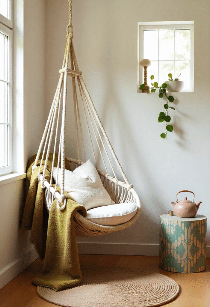 Create a bohemian relaxation nook with a macramé hammock chair suspended from the ceiling. Add a plush cushion and a knitted throw in a rich color like olive green. Place a small jute rug underneath and a hand-painted side table nearby for a teapot or book. This cozy corner is perfect for reading or unwinding in true Anthropologie style.