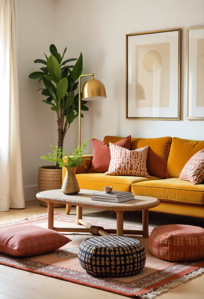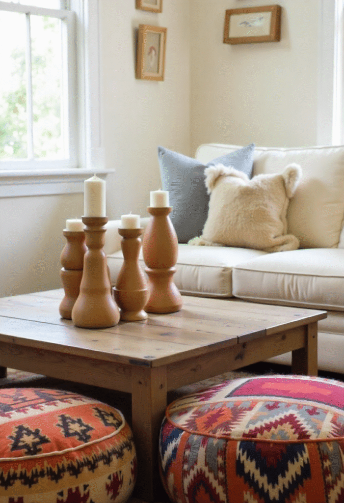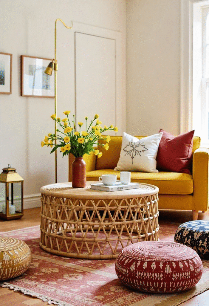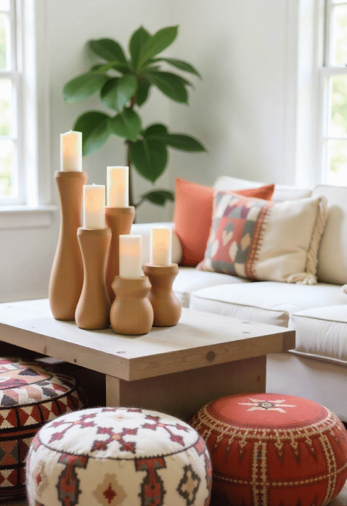 Scatter a few floor poufs upholstered in kilim or ikat-inspired fabrics in a living room or lounge area. Choose bold patterns like stripes or medallions in earthy tones to complement neutral furniture. These versatile pieces double as extra seating or footrests, adding a playful, global touch to your space.