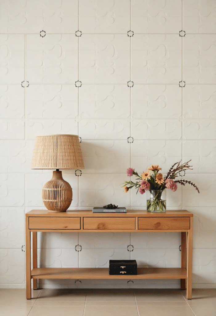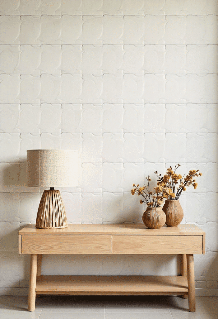 Transform a wall with handcrafted ceramic tiles featuring scalloped edges or subtle wave patterns in neutral glazes like cream or charcoal. This textured accent wall adds an artistic, handmade feel to dining rooms or hallways. Pair it with a wooden console holding a rattan lamp and dried florals for a cohesive, eclectic look.