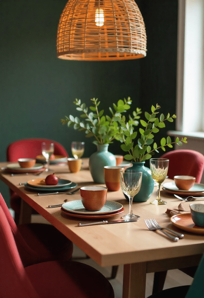 An eclectic boho tablescape brings a warm, collected feel to everyday dining by blending handcrafted ceramics, soft greenery, and layered textures. A wooden table sets the foundation, while mismatched plates, earth-toned mugs, and artisanal vases add character without feeling chaotic. Soft greenery like eucalyptus brings movement and freshness, balancing the deeper tones of upholstered chairs or stoneware pieces. A woven pendant light overhead completes the mood by casting a gentle glow that highlights the tactile details across the table. This style works beautifully for both casual meals and intimate gatherings, creating a dining setup that feels inviting, creative, and thoughtfully curated.