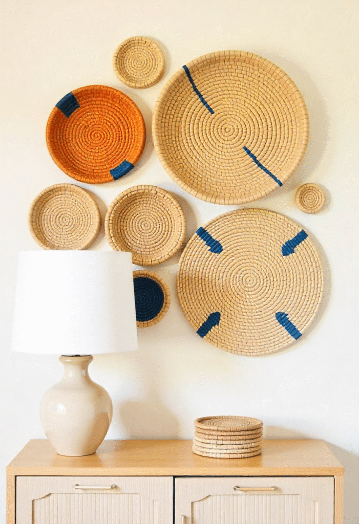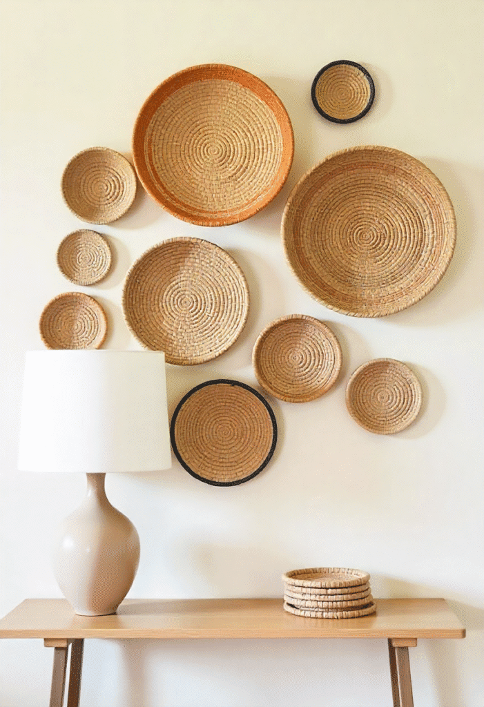 Create a striking focal point by arranging handwoven baskets on a wall. Combine seagrass, jute, or rattan baskets in varied sizes and shapes, incorporating pops of dyed colors like indigo or ochre. This textured display, set against a neutral wall, adds a global-inspired touch. Place a low console table below with a ceramic lamp or a stack of woven coasters to complete the look. This approach brings warmth and dimension to living rooms or entryways.