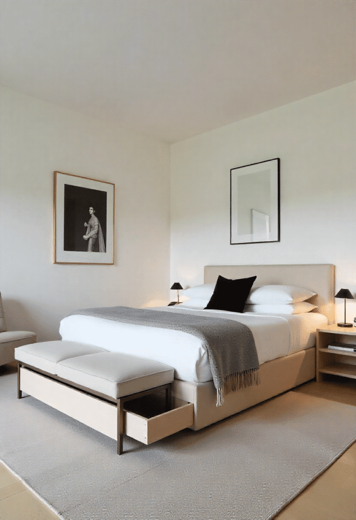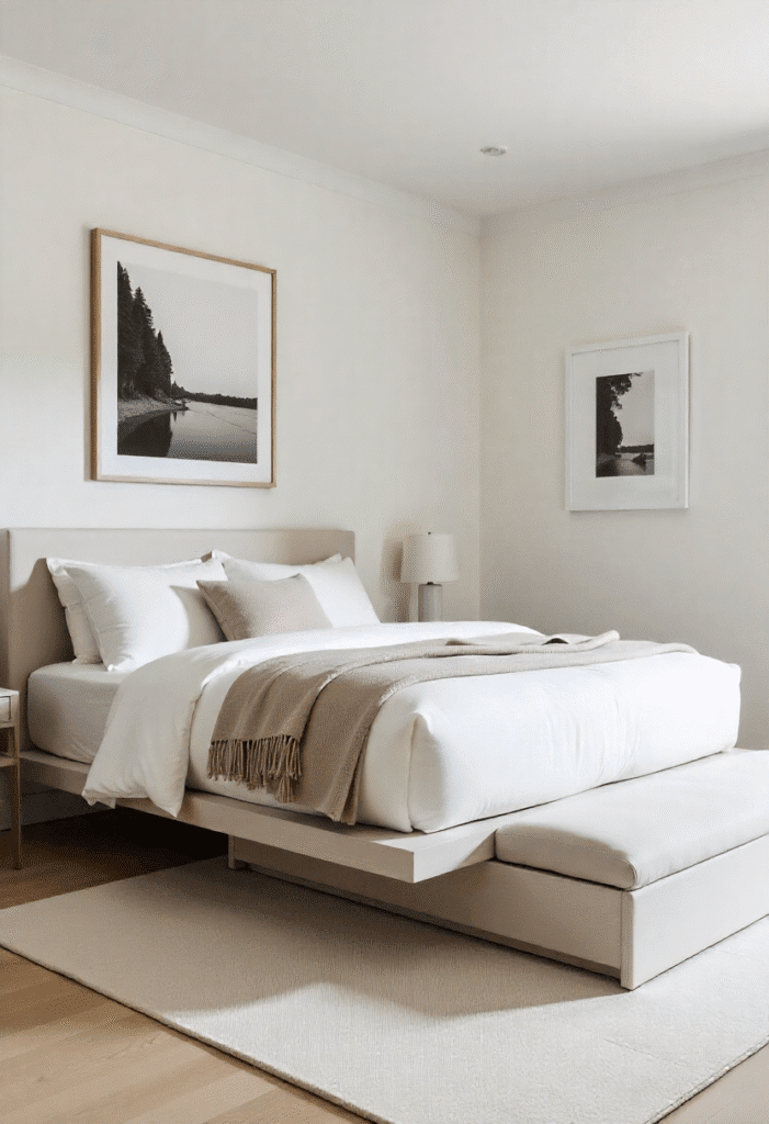 Create a spacious, minimalist bedroom with a floating bedframe. This design keeps the floor clear for an airy, open feel while providing hidden storage drawers underneath. Keep additional furniture to a minimum, opting for just a simple bench or a sculptural chair at the foot of the bed. A neutral or black-and-white photography print on the wall serves as a subtle but impactful focal point, and a soft, comfortable throw adds warmth.